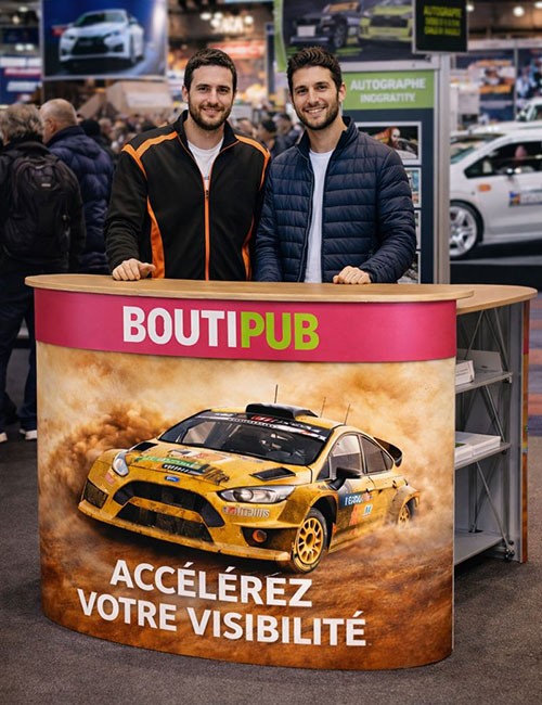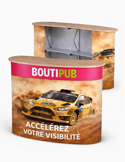 Le comptoir parapluie courbe est idéal pour les salons professionnels, foires, congrès, animations commerciales et événements itinérants.