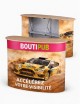 Le visuel personnalisé (en option) est imprimé sur un média Pop-Up et livré en un seul lé, sans raccord visible. Il enveloppe élégamment la structure tout en laissant l’accès libre aux étagères internes.