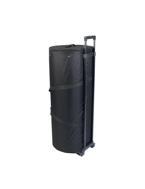 Une fois replié, l’ensemble du comptoir (structure, plateau, étagères et visuel) se range dans une valise à roulettes renforcée, fournie avec un tube carton pour protéger le visuel lors des déplacements.