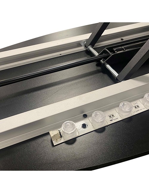 Le plateau et la base en MDF noir (15 mm) offrent un rendu visuel sobre, idéal pour accentuer la luminosité des visuels rétro-éclairés. La combinaison acier / aluminium confère à l’ensemble une excellente rigidité, adaptée à un usage intensif en environnement événementiel.