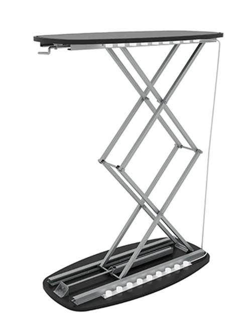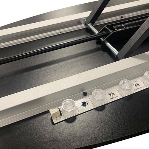 Grâce à son mécanisme articulé à ciseaux, le comptoir Insta LED se met en place par simple élévation du plateau. La structure se verrouille automatiquement, garantissant une stabilité immédiate sans nécessiter d’outil ou d’ajustement technique.