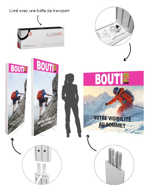 La gamme iLLUMiGO repose sur quatre piliers essentiels : un montage rapide sans outils, un éclairage LED puissant préinstallé, une facilité de transport et la réutilisation des structures grâce à des visuels textile interchangeables. Chaque totem est livré dans une boîte de transport compartimentée, permettant de protéger l’ensemble des composants et de simplifier les déplacements.