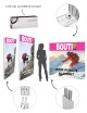 Conçu en aluminium blanc au design épuré, le totem iLLUMiGO est proposé exclusivement en recto-verso lumineux pour une visibilité optimale. Les visuels sont imprimés sur textile backlight (textile diffusant), souple et interchangeable, avec jonc PVC pour un maintien parfait dans le profilé. L’ensemble se range dans une boîte de transport compartimentée, facilitant le stockage et les déplacements.