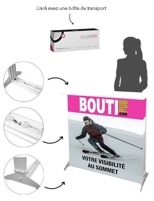 Le comptoir lumineux Illumigo™ est conçu pour les salons professionnels, expositions, points de vente et événements. Son cadre en aluminium blanc (épaisseur 100 mm) s’assemble sans outil grâce à un système numéroté simple, tandis que le rétro-éclairage LED tangentiel est inclus et pré-assemblé pour une installation rapide en plug-and-play.