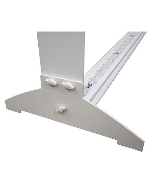 Sa structure en aluminium blanc assure un rendu moderne et épuré, tandis que l’éclairage LED intégré garantit une luminosité régulière, sans zone d’ombre. Le visuel textile cousu avec jonc s’insère parfaitement dans le cadre pour un rendu tendu et professionnel.