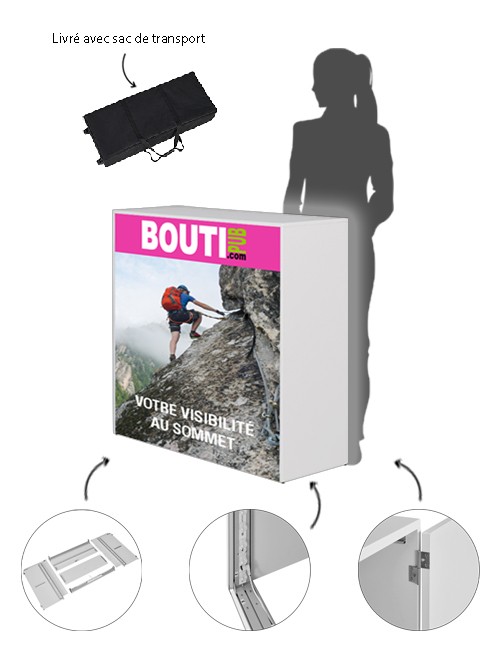 Conçu pour les salons professionnels, showrooms, animations commerciales et événements itinérants, il offre également un espace de rangement sécurisé avec portes et verrou. Son visuel interchangeable permet d’adapter facilement votre communication au fil de vos campagnes.
