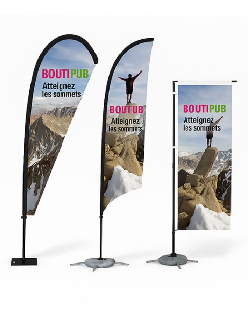 Personnalisez votre drapeau publicitaire sur BoutiPub et profitez d’un large choix de formes, de tailles et de bases adaptées à tous vos besoins.