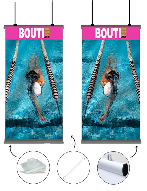 Le kakémono suspendu est idéal pour la communication en magasin, vitrine ou salon professionnel. Suspendu au plafond, il permet d’attirer facilement l’attention et de mettre en avant promotions, informations ou messages publicitaires.