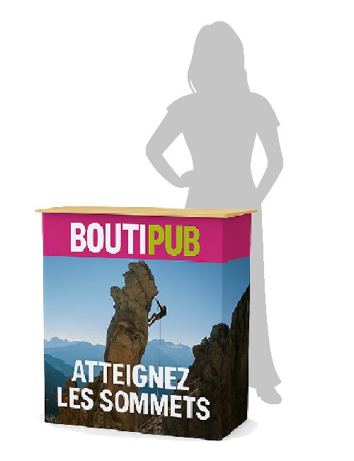Pour optimiser votre stand publicitaire, combinez un comptoir textile tendu en façade avec un comptoir parapluie en arrière-plan. Ajoutez l’option dos noir occultant si votre stand est exposé à de fortes sources lumineuses.