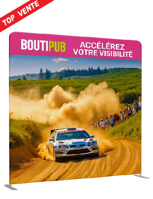 Ce modèle est proposé en format fixe 2 mètres × 2 mètres, idéal pour créer un photocall, un fond d’interview ou une cloison textile élégante et entièrement réutilisable.
