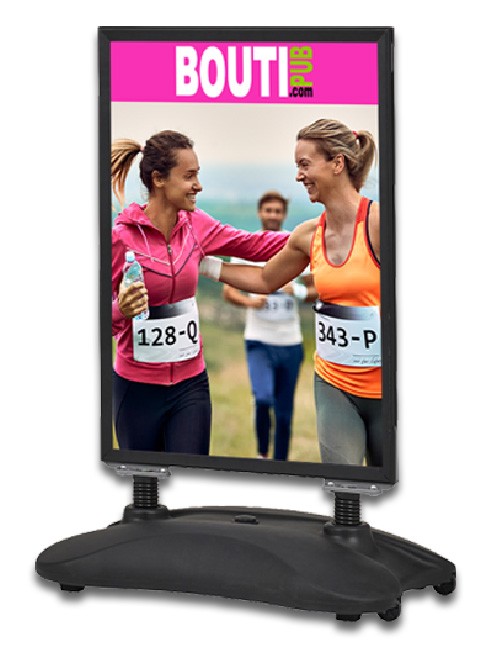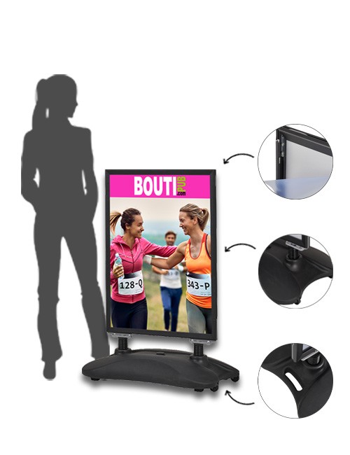 Le cadre clic-clac s’ouvre facilement pour un changement d’affiche illimité, sans outils. L’embase lestable assure une bonne stabilité et intègre roulettes + poignée pour déplacer votre stop trottoir en un geste.
