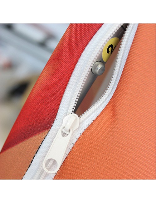 - Tissu extensible qui s’enfile comme une housse et zip de fermeture pour une tension homogène sans plis.